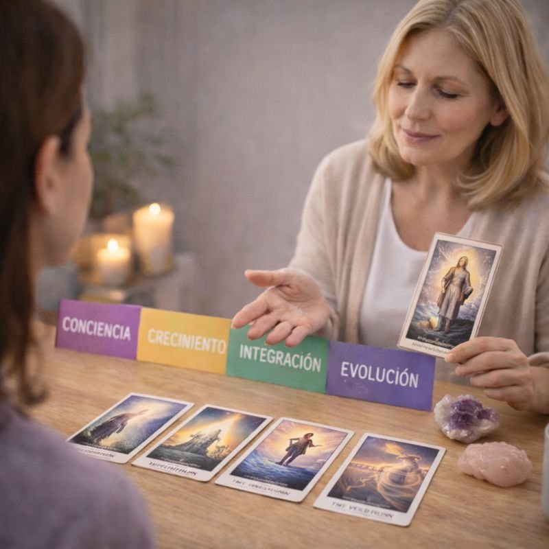 Tarot Evolutivo para conocernos en profundidad, conocer nuestro propósito y ayudarnos a avanzar en la vida. Tarot profundo enfocado en el crecimiento personal y espiritual, diseñado para identificar bloqueos del alma, aprendizajes kármicos y pasos conscientes hacia tu evolución.